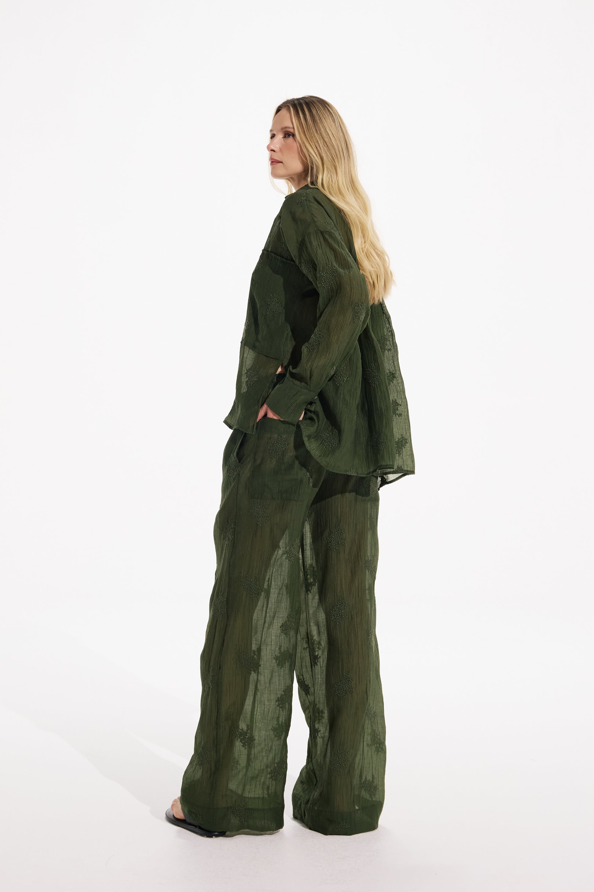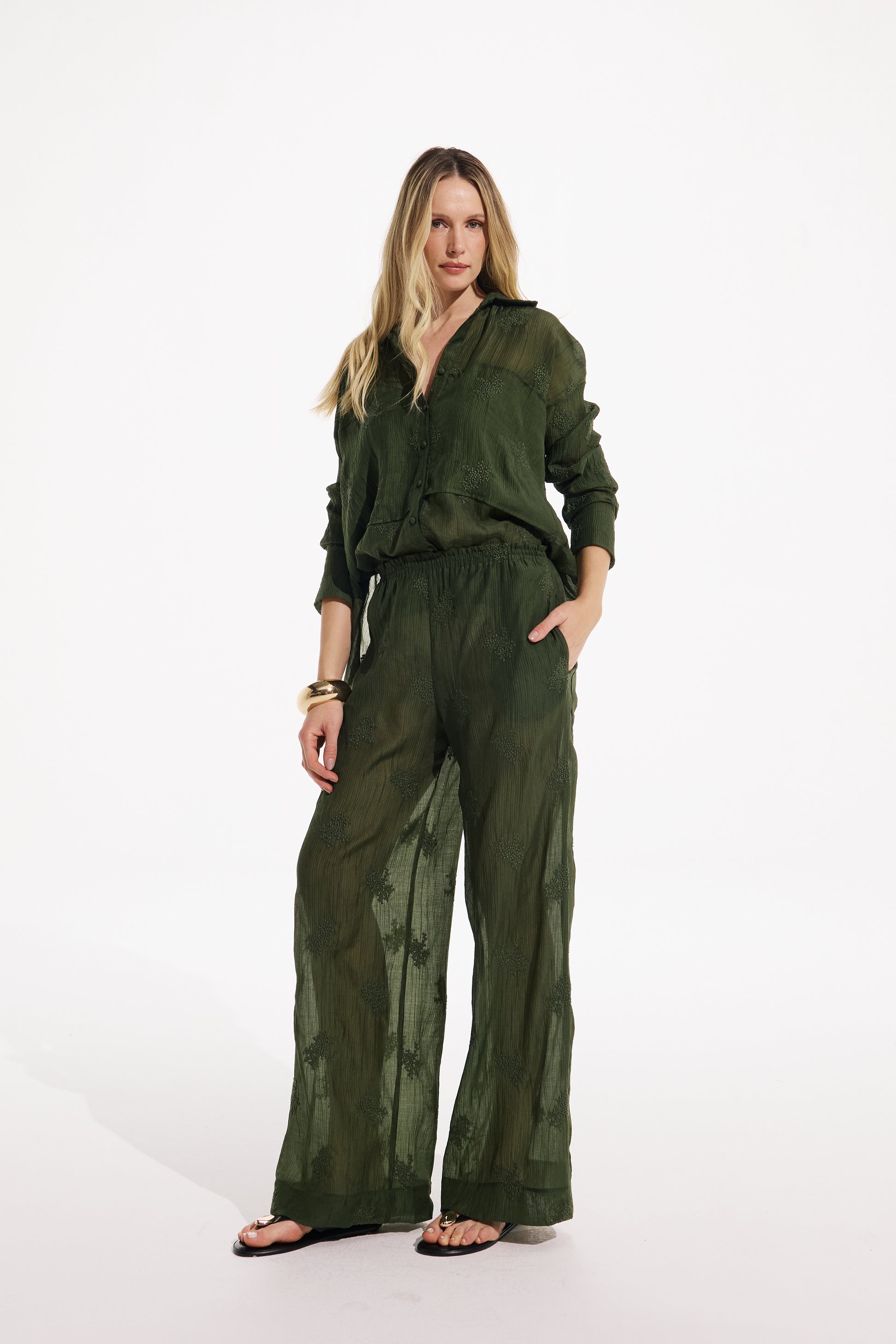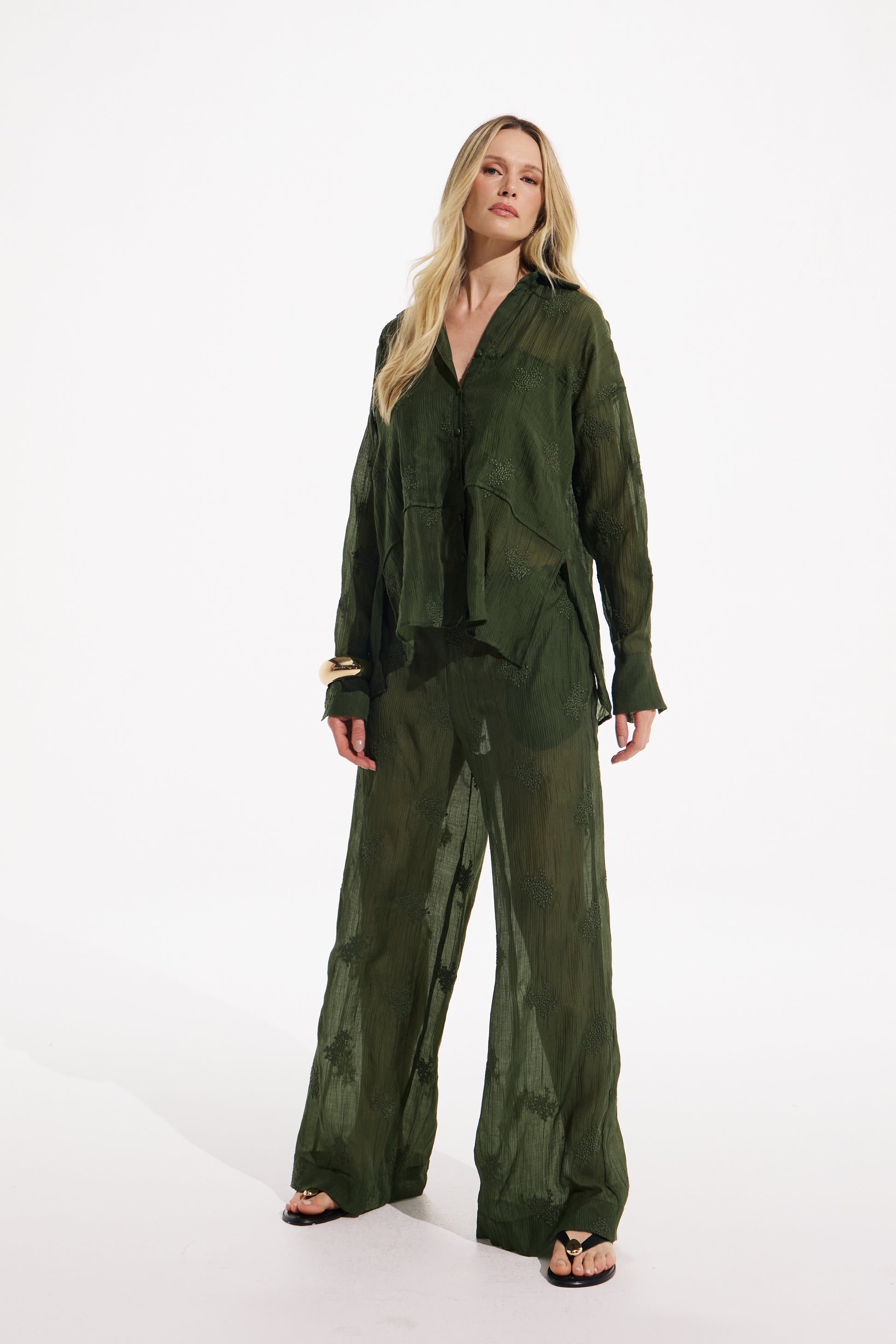A calça apresenta um caimento amplo e elegante, com inspiração na alfaiataria. O tecido translúcido texturizado cria um efeito sofisticado e versátil. A fluidez da peça alonga a silhueta, e o cós com elástico garantepraticidade. Pode ser usada com a camisa coordenada para um conjunto impecável ou combinada com peças lisas para uma proposta moderna.