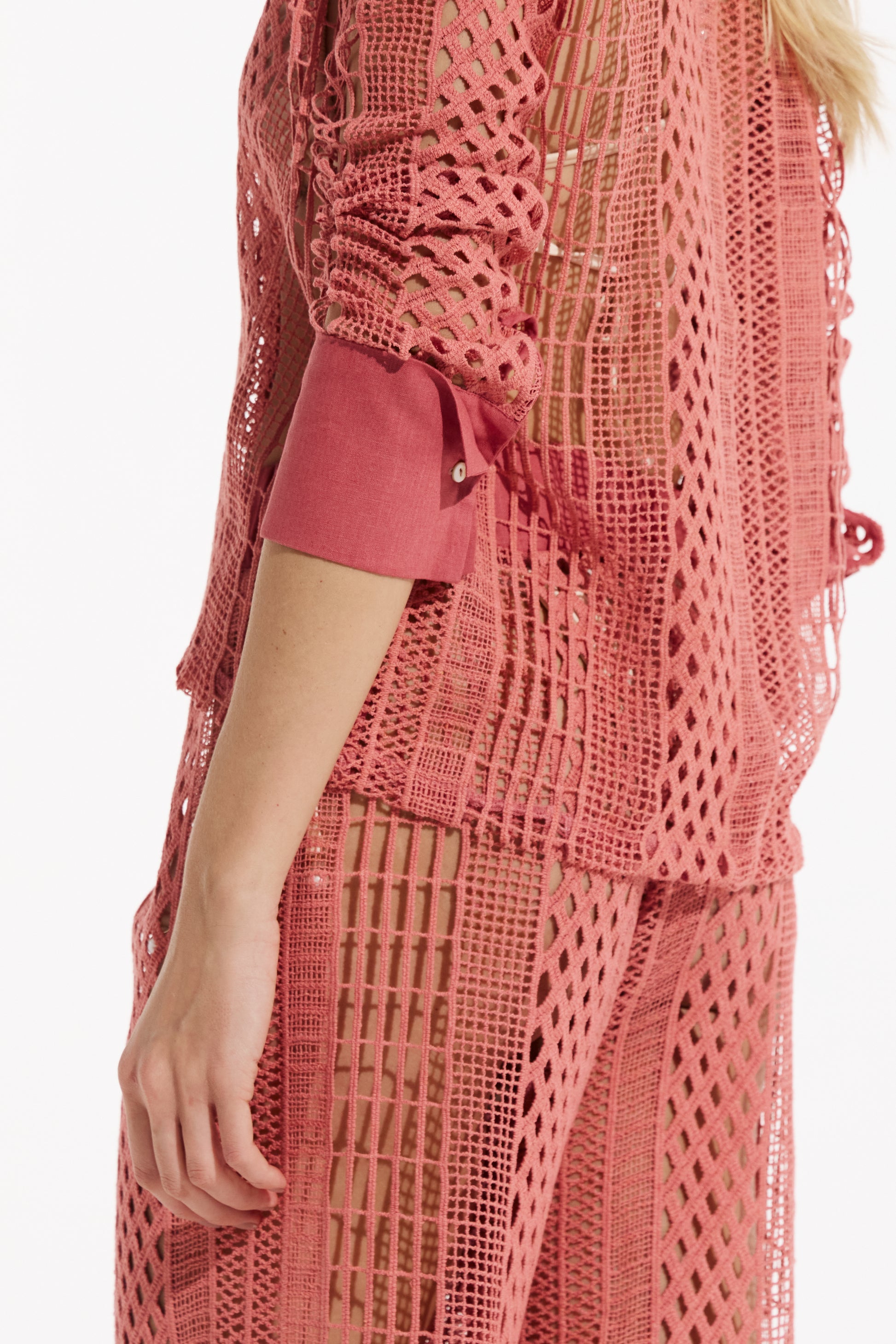 A camisa Alanis é uma peça clássica e sofisticada. Elaborada em renda guipir com delicados detalhes em linho, ela confere elegância e personalidade ao seu closet. Apresenta modelagem com aberturas laterais, fechamento frontal e punhos adornados com botões de madrepérola, que realçam seu acabamento refinado.