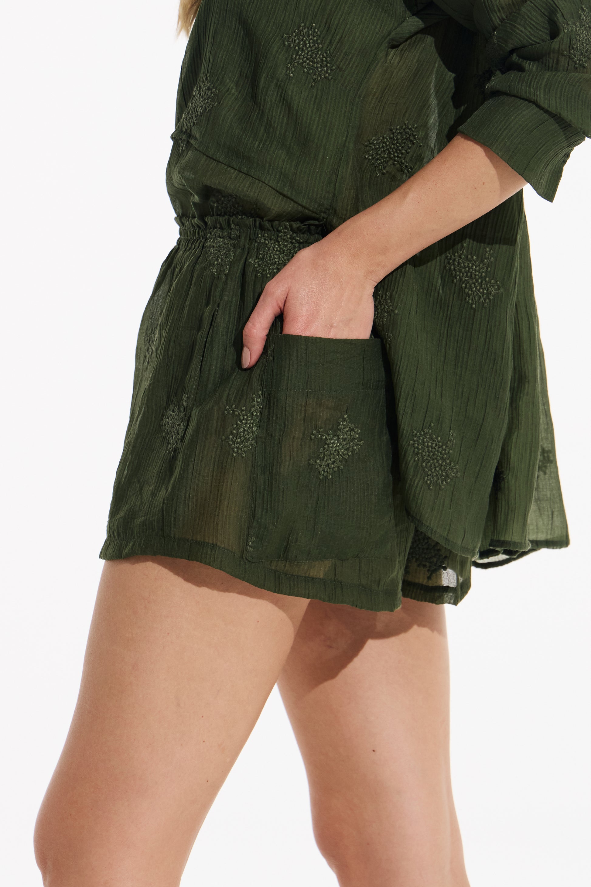 O short combina praticidade e estilo. Com modelagem ampla e fluida, ele valoriza a silhueta de forma natural. O cós com elástico garante ajuste perfeito ao corpo, e os bolsos laterais trazem funcionalidade ao look. A textura da renda se destaca, criando um visual leve e contemporâneo. Ideal para compor desde looks casuais até produções mais arrumadas.